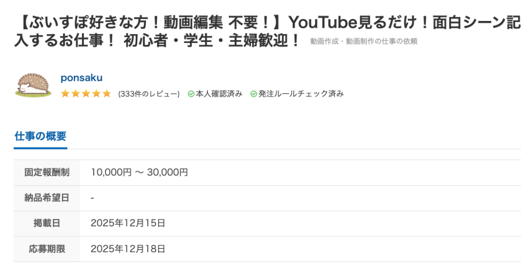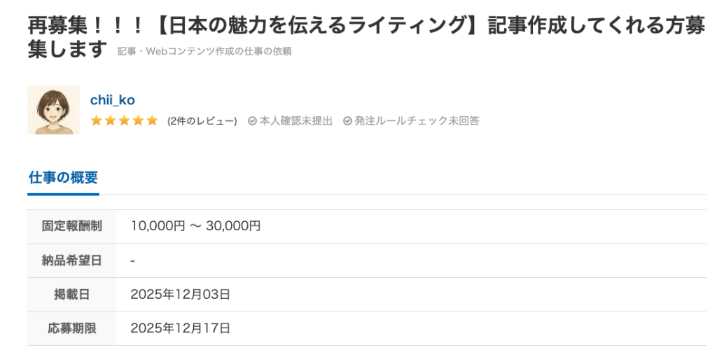 また、本人確認の有無も確かめましょう。例えばクラウドワークスでは、本人確認書類の提出があるクライアントには「本人確認済み」、提出がないクライアントには「本人確認未提出」とステータスの記載があります。