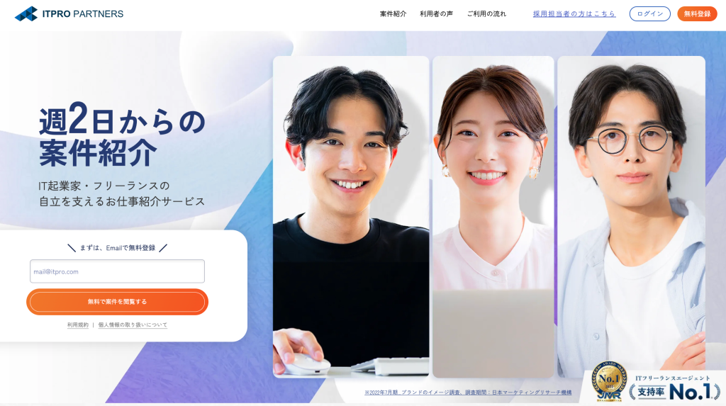 弊社ITプロパートナーズは、週2、3日から参画できる案件を多く扱うITフリーランス向けエージェントサービスです。