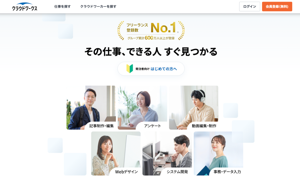 クラウドワークスは、日本最大級のクラウドソーシングサービスで、登録ワーカー数600万人以上、利用企業数100万社を誇ります。