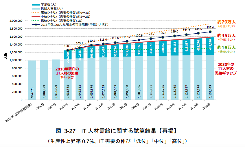 Webデザイナーには、今後も高いニーズが見込まれます。以下は、2030年までに想定されるIT人材の不足数を表しています。この図からも分かるように、今後もWebデザイナーを含むIT人材はどんどん需要が伸びていくことが想定されます。