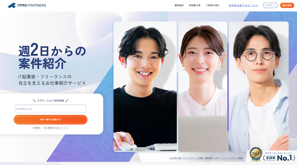 「ITプロパートナーズ」はIT/Web分野に特化したフリーランス向けエージェントです。リモート案件が全体の7割で、ITエンジニアを中心に、マーケター、デザイナーなどIT系の職種に対応しています。起業家やフリーランスの支援を目的にスタートしたサービスで、「フルリモート可能」「週3日〜の稼働」などの案件も多数取り扱っています。