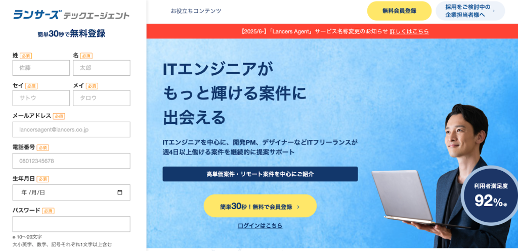 「ランサーズ テックエージェント」は、クラウドソーシングの大手として知られるランサーズのグループ企業が運営するフリーランス向けエージェントです。