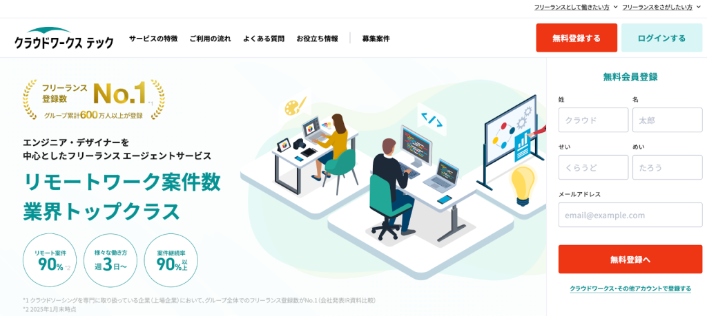 | クラウドワークステック (旧クラウドテック) | ・エンジニア ・Webデザイナー ・コンサルタント | 約75% | 12,425件 |