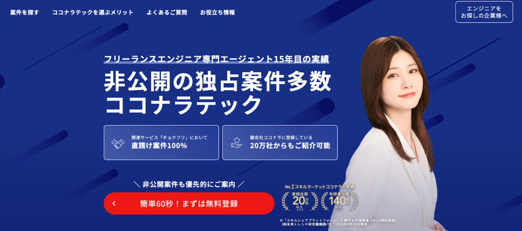 また、エンド直の高単価案件が豊富で、スタートアップやベンチャーの案件も多く、エンジニアとしてやりがいを感じられる仕事が多い点も魅力。自由度の高い働き方をしたい人や、フリーランスとして魅力的な案件を獲得したい方におすすめのエージェントです。