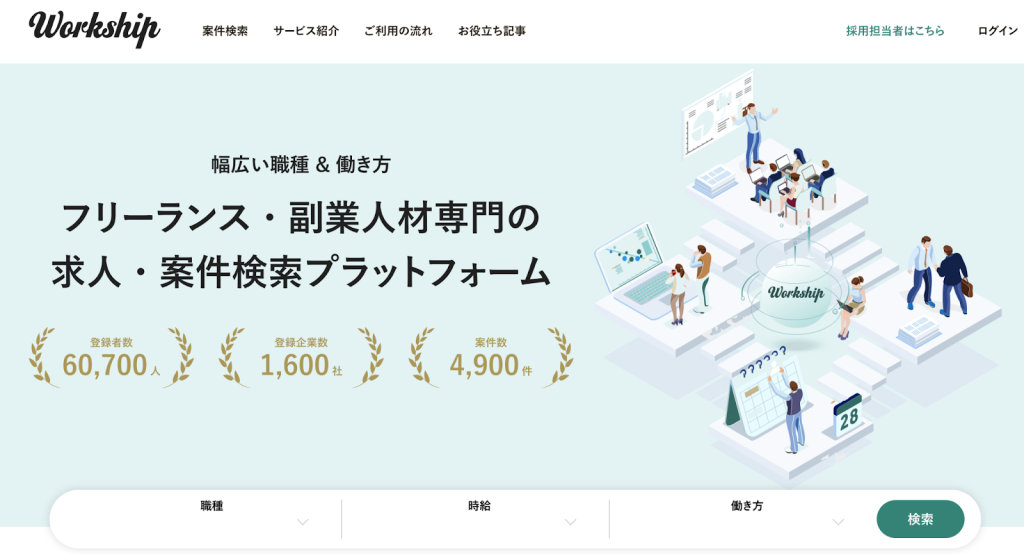 Workshipは、フリーランス・副業向けのマッチングサービスで、リモート可能な案件や週1〜3日から働ける案件が多く、最短で即日マッチング可能なスピード感が特徴です。機械学習によって登録者をスコアリングして、クライアントと効率的にマッチングしてくれます。経験が問われる案件も多いため初心者の利用はあまり向いていません。