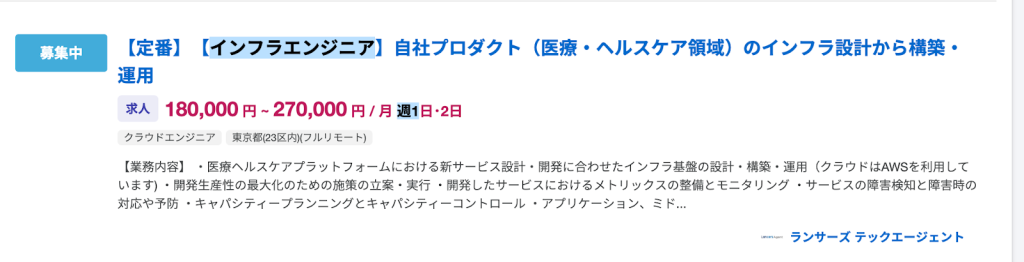 週1で挑戦できるインフラエンジニアの副業案件は、以下のように存在しますが、非常に少ないのが実情です。