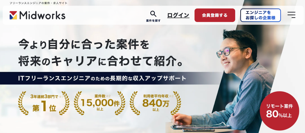 「Midworks」の特徴は、高単価案件の多さです。利用者の平均年収は840万円以上で、スキルや実績があれば年収1,000万円に届く可能性は十分あります。正社員から独立してMidworksを利用し、年収を600万円アップさせたなど、年収アップ事例も豊富にあります。