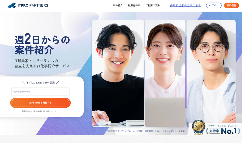 弊社「ITプロパートナーズ」は、ITエンジニア、Webデザイナー、マーケターといったフリーランスのプロ人材と、クライアントをマッチングさせるエージェントサービスです。
