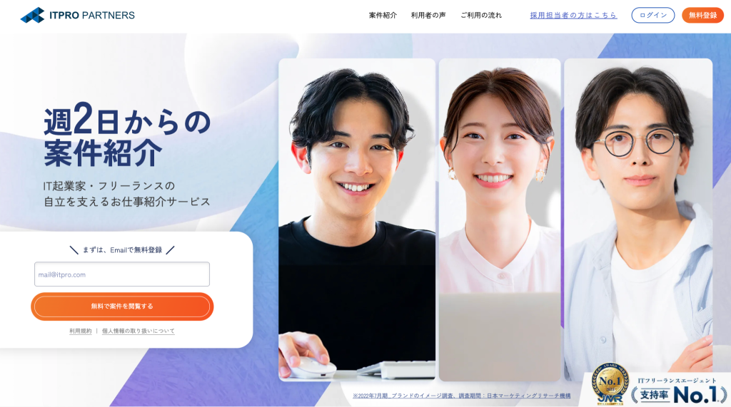 弊社「ITプロパートナーズ」では、実務経験が豊富なフリーランス向けに、高単価案件紹介をしています。仲介会社を挟まず、直接クライアントと契約しているため、高単価な案件が多いのが特徴です。