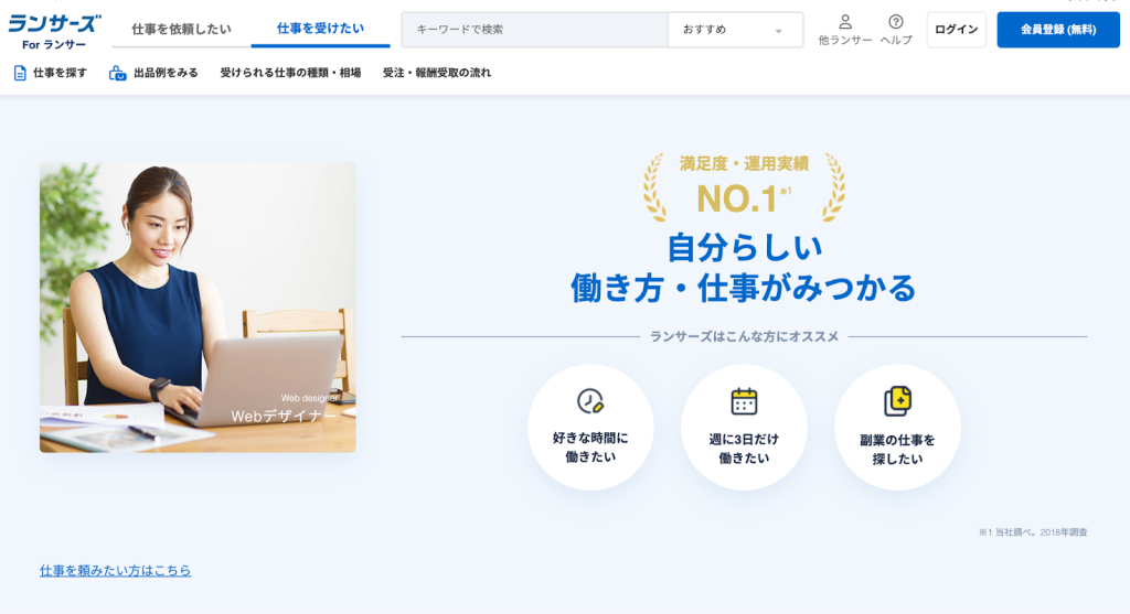 「ランサーズ」は日本最大級のクラウドソーシングサービスで、多くのフリーランスや副業ワーカーが利用しています。掲載されている案件に応募するほか、プロフィールを見たクライアントからのスカウトや、報酬や条件などを決めて販売するスキルパッケージ、クライアントとマッチングしてくれるエージェントサービスなど、幅広い案件獲得方法が用意されています。