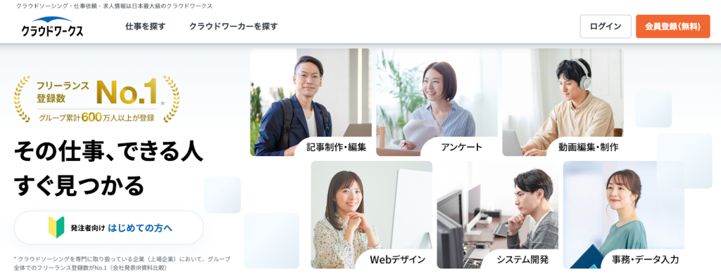 「クラウドワークス」は、ランサーズ同様に代表的なクラウドソーシングサービスの1つです。全国約100万社のクライアント、約600万人のユーザー数が利用していて、とにかく案件数が豊富。仕事のカテゴリーは200種類以上で、求められるスキルレベルも案件によってさまざまなので、初心者でも対応できる案件が見つかりやすいでしょう。
