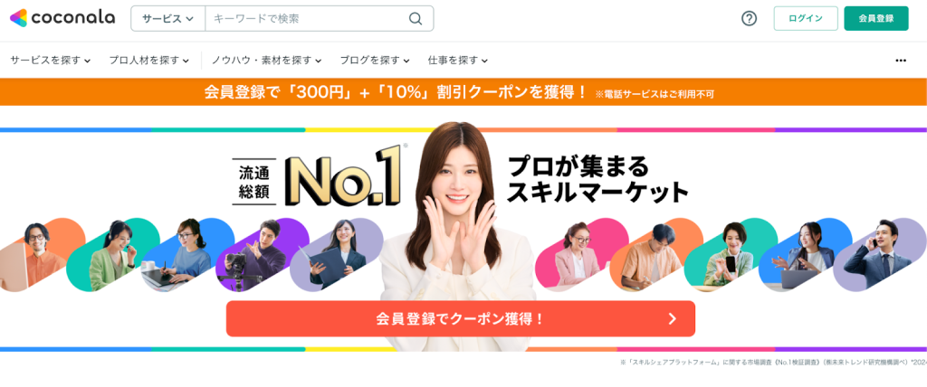 「ココナラ」は、自分の持つスキルを取引できるスキルマーケットサービスです。仕事のカテゴリが多く、イラストやWebサイト制作から占いや悩み相談まで、出品できるスキルのジャンルが幅広いのが特徴。自分の持つスキルや経験を出品するだけでなく、スキルや経験を持つ人を探している依頼者を探して自分から提案することも可能です。
