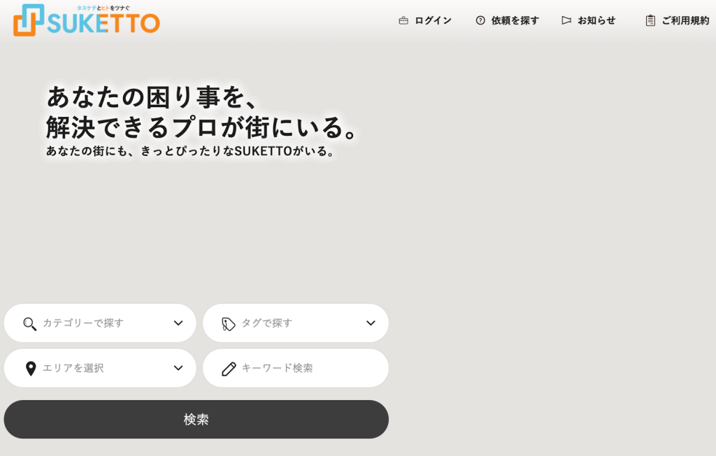 「SUKETTO」は、助っ人と呼ばれるワーカーを、カテゴリーとエリアの情報から探せるサービスです。助っ人は家事代行や軽作業に加え、施工関連のスキルを活かして働けます。募集を集めるため、自身の所在地やサービス内容を詳細にプロフィールに掲載しましょう。