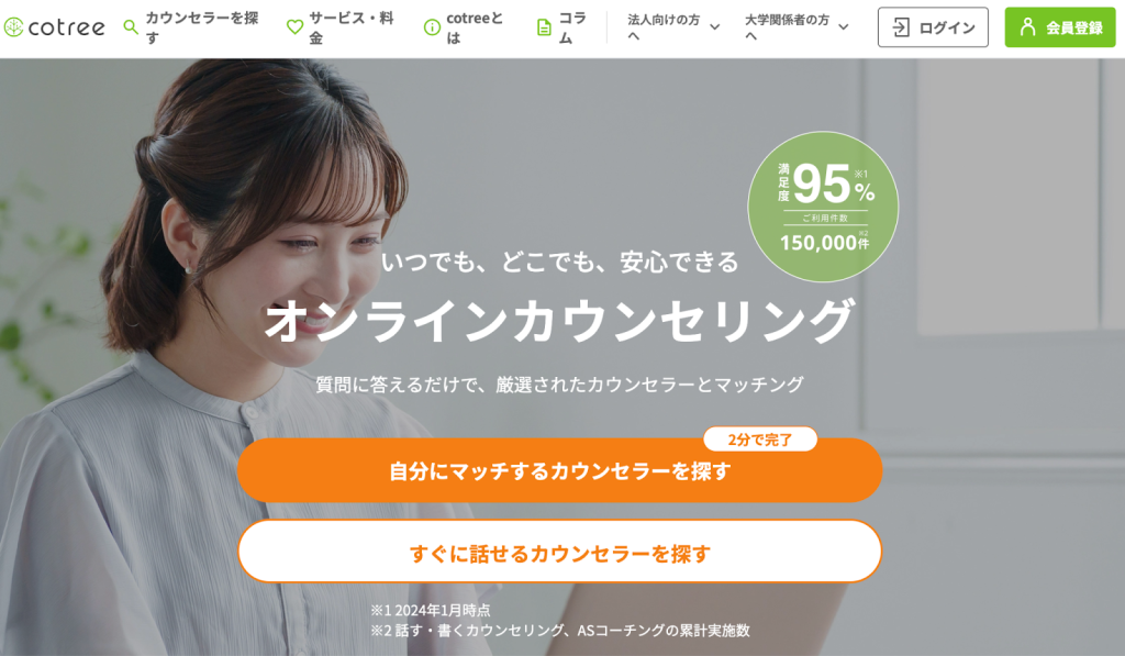 「cotree」は、悩みを抱えている人とカウンセラーをつなぐプラットフォームです。カウンセラーになるには臨床心理士や産業カウンセラーといった資格と3年以上、100回以上のカウンセリング経験が必要です。カウンセリング料金の一部は手数料として引かれますが、手数料の具体的な金額についてはサイト上では明らかになっていません。