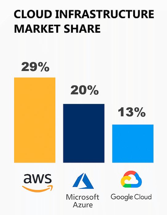 その最大の理由は、圧倒的な市場シェアの高さにあります。Synergy Research Groupの調査(2025年第3四半期)によると、全世界のクラウドインフラ市場においてAWSは29%というトップシェアを維持しており、2位のAzure(20%)、3位のGoogle Cloud(13%)を大きく引き離しています。