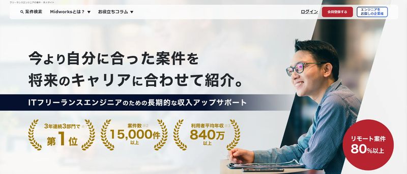 「ミッドワークス」は、ITフリーランスエンジニアを対象に案件を紹介するフリーランスエージェントです。2025年4月時点で公開案件数が10,000件以上あり、全体の80%は未公開案件になっているので、通常は見つからない魅力的な案件に参画できます。