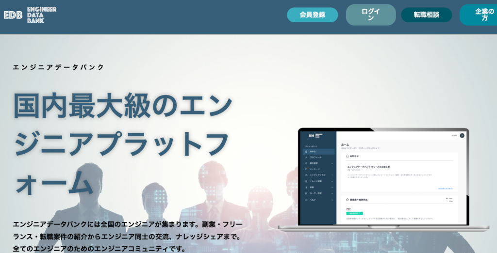 エンジニアデータバンクは、副業・フリーランス・会社員など、立場を問わずエンジニアであれば誰でも登録できるプラットフォームです。副業案件の検索だけでなく、エンジニア同士がナレッジを共有したり、つながりを広げたりできる機能も提供されています。