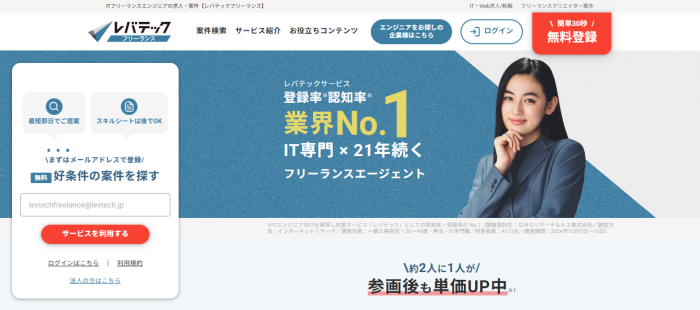 レバテックフリーランスも、ITプロパートナーズと同様、スタッフから案件の紹介を受けられるフリーランスエージェントです。
