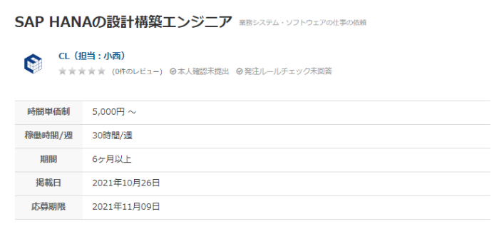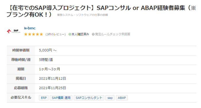 こちらは在宅で受けられるSAP導入コンサルタント案件で、週に5時間程度の稼働なので、初めての副業案件としてはじめやすい仕事です。