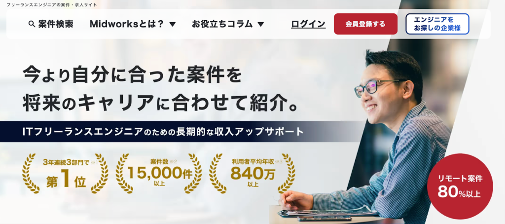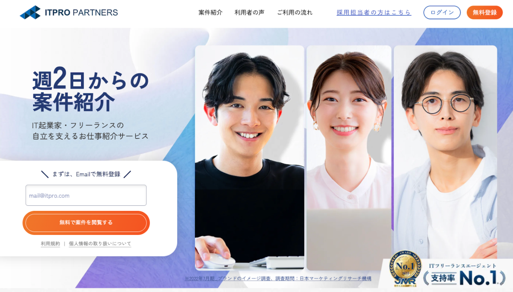 「ITプロパートナーズ」は、フリーランスのIT/Web系エンジニア・デザイナー向けのエージェントです。企業と直接契約するエンド直案件が多いため、高単価なリモート案件が豊富です。