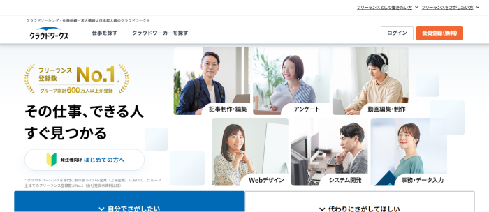 クラウドワークスは、有名なクラウドソーシングサイトの1つです。ランサーズと同様、たくさんの種類の案件があります。ランサーズにはない案件が募集されている場合もあるため、クラウドソーシングサイトを利用するならクラウドワークスにも登録するのがおすすめです。少しでも多くの案件を見つけられれば、受注できる可能性はその分だけ高くなります。