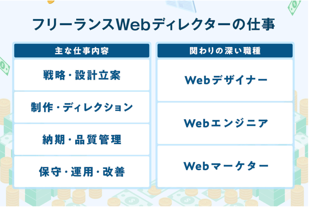 フリーランスWebディレクターとは、どのような仕事でしょうか。ここでは、具体的な仕事内容や関連する職種について解説します。