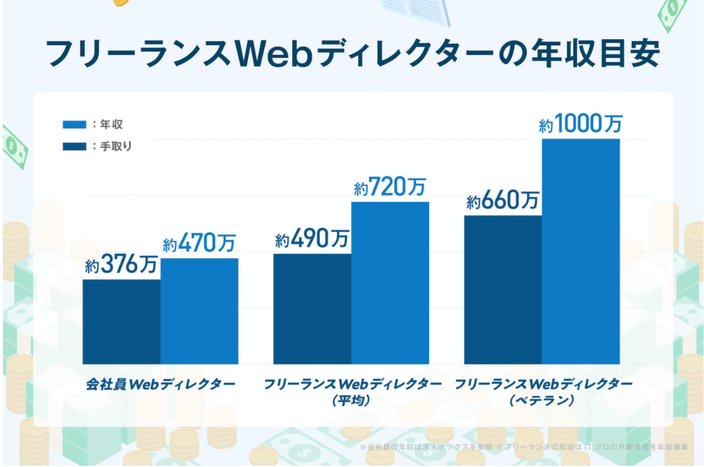 上記グラフの通り、スキルや経験があればフリーランスWebディレクターは会社員と比べて収入アップする可能性が高いです。