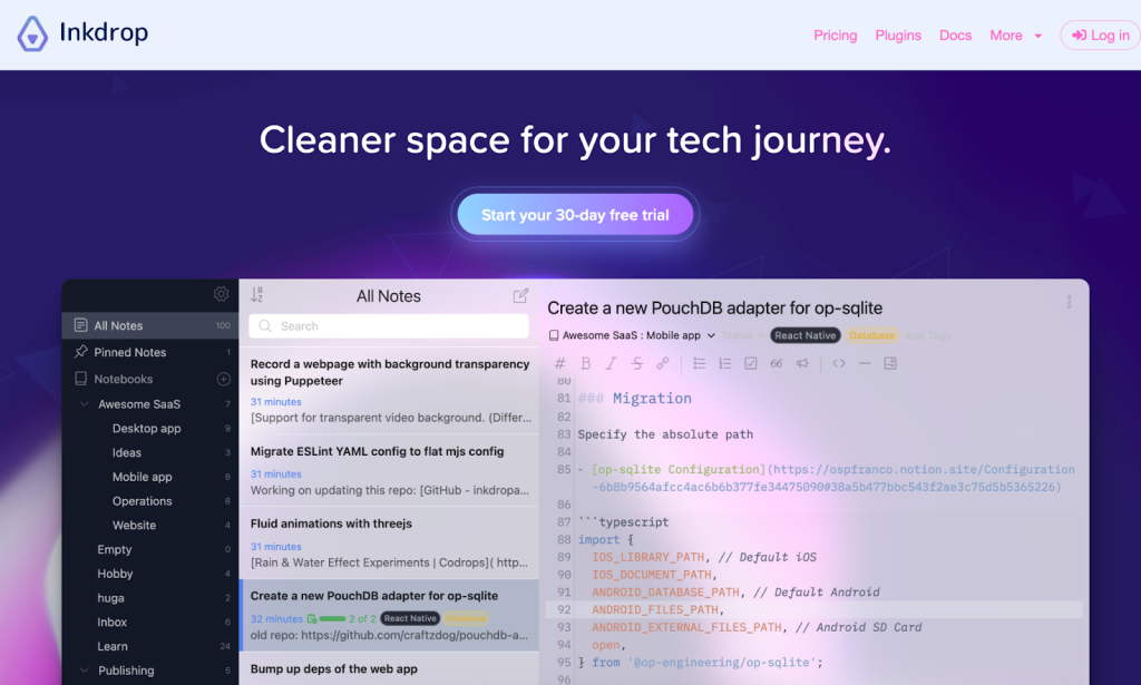 Inkdropは、日本人エンジニアによって開発されたMarkdownエディタです。Windows・Mac・Linux・iOS・Androidと対応デバイスが非常に幅広く、デバイス間の同期にも対応しています。特定のプログラミング言語を指定して構文ハイライトを行う機能もあり、プログラミング用途にも活用できます。