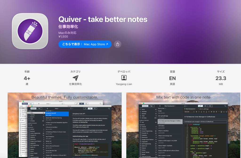 Quiverはプログラマー向けに開発されたノートアプリで、Markdownに加えてコードブロックの管理やノート共有などの機能を備えています。HTML・Markdown・PDF形式でのエクスポートにも対応しており、作成したMarkdownをGitHubなどに投稿する際にも便利です。