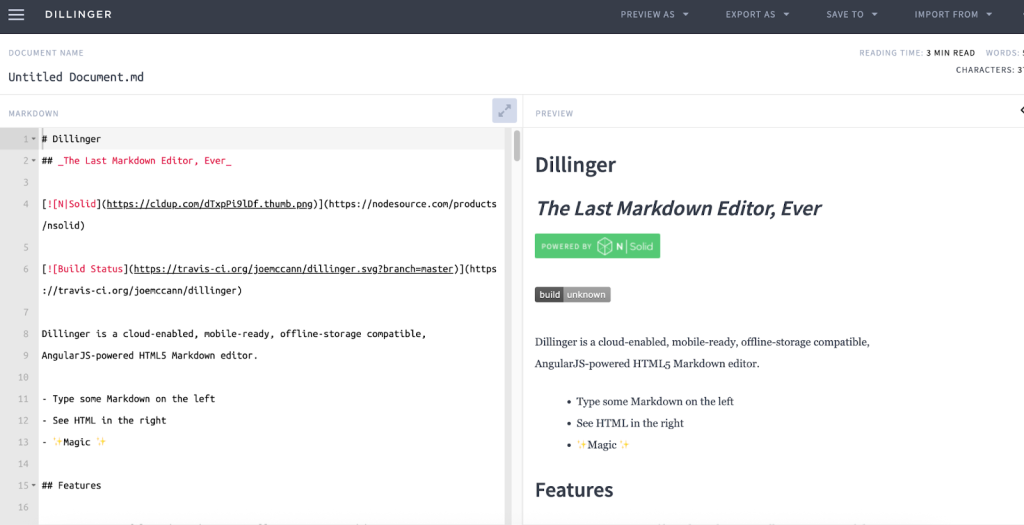 Dillingerは、パソコンだけでなくモバイル端末にも対応しているオンラインMarkdownエディタです。リアルタイムプレビュー機能を備えており、記述内容を確認しながら作業できます。GitHubやDropboxからファイルをインポートできるため、既存のMarkdownファイルを編集する用途にも向いています。