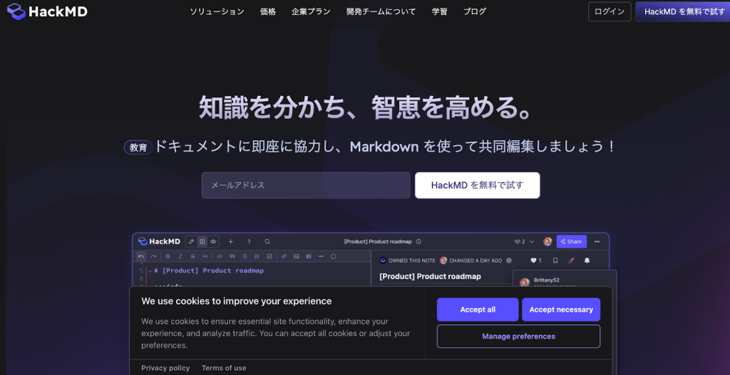 HackMDは、Markdown記法でドキュメントをリアルタイムに共同編集できるツールです。パソコン・スマートフォン・タブレットなど、さまざまなデバイスから同時に編集でき、チームでの情報共有や議事録作成に適しています。スライド作成機能も搭載されており、Markdownで記述した内容をプレゼン資料として活用できる点も特徴です。