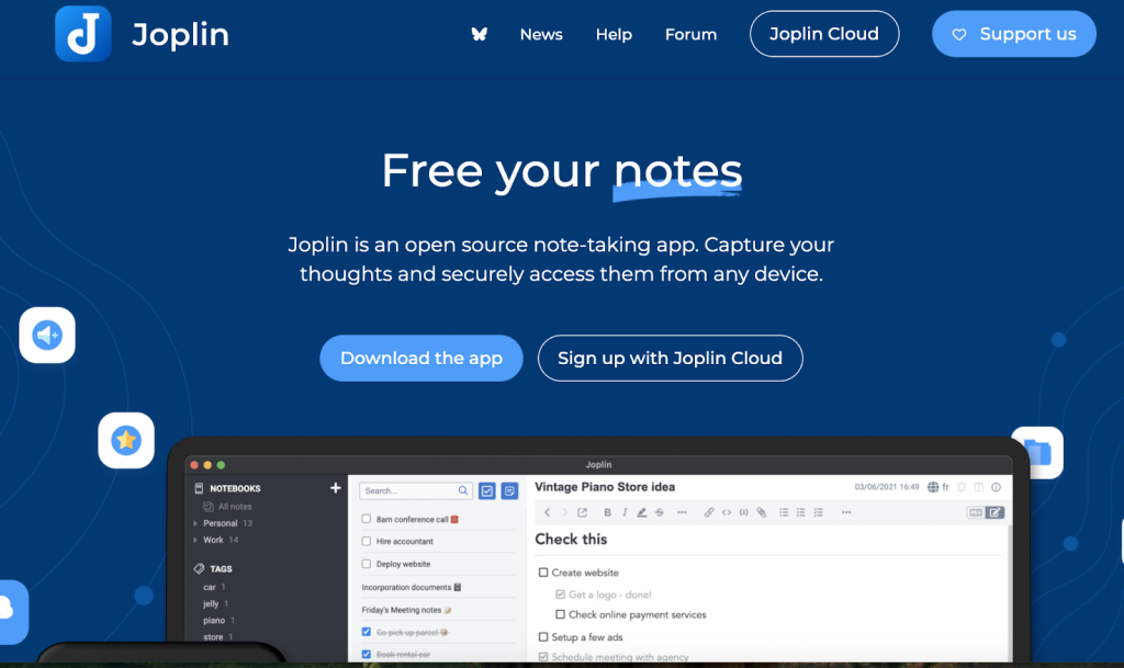Joplinは、Markdown記法に対応したノート作成アプリです。DropboxやOneDriveなどのクラウドサービスと同期できるため、パソコンやスマートフォンなど複数のデバイスから閲覧・編集が可能です。また、プラグインによる機能拡張やデザイン変更にも対応しています。